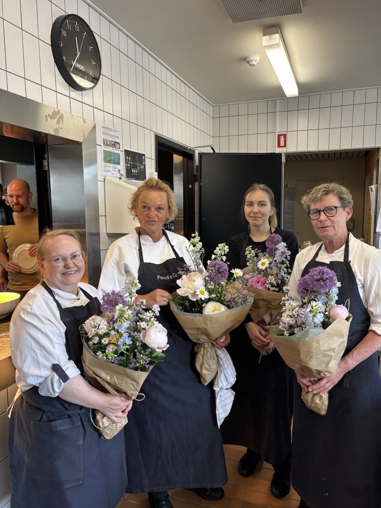 Godt gået af hele Compass-køkkenteamet hos Verdo bestående af Charlotte, kok, Dorthe, køkkenchef, Verona, køkkenmedhjælper og Annette, kok, som ses på billedet med de buketter, de har modtaget for det.